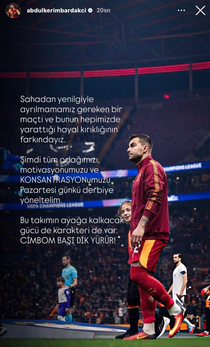 Galatasaray, Union Saint-Gilloise mağlubiyeti sonrası gözünü 1 Aralık’ta oynanacak Fenerbahçe derbisine çevirdi. Bu doğrultuda sarı-kırmızılı ekipte Abdülkerim Bardakcı sosyal medya hesabından bir paylaşım yaptı.