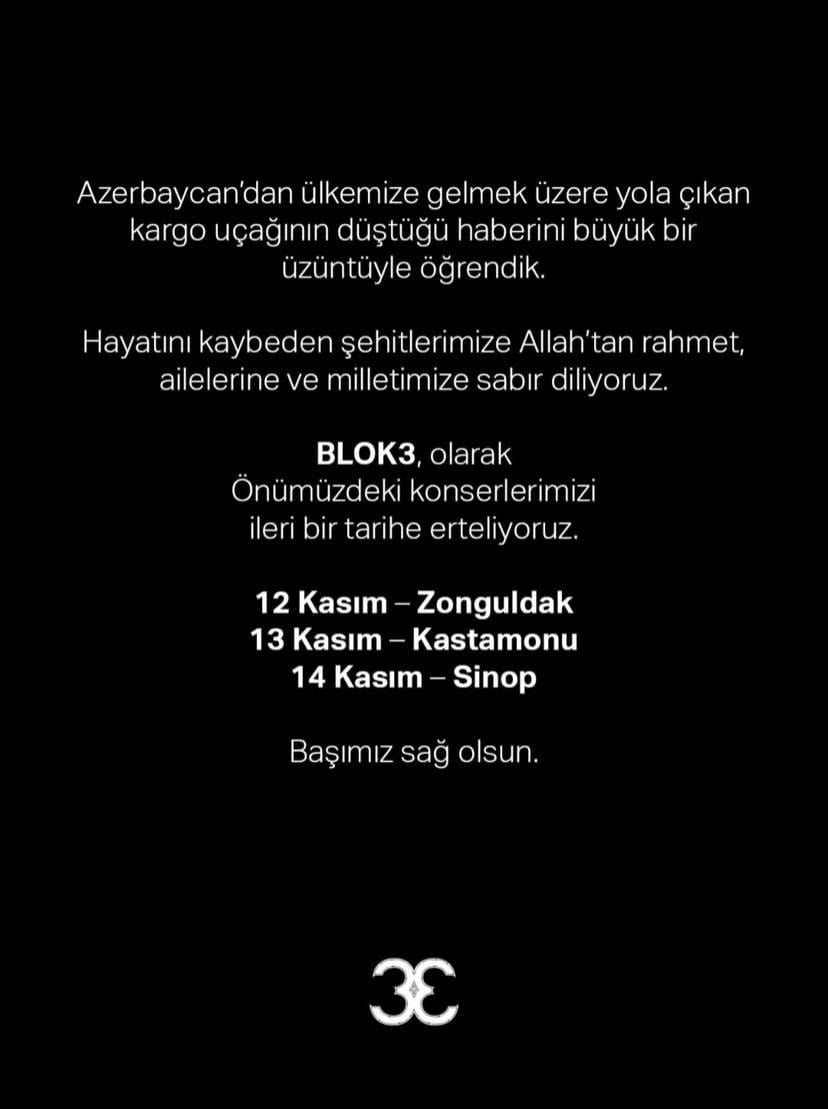 “Azerbaycan’dan ülkemize gelmek üzere yola çıkan kargo uçağının düştüğü haberini büyük bir üzüntüyle öğrendik. Hayatını kaybeden şehitlerimize Allah’tan rahmet, ailelerine ve milletimize sabır diliyoruz. Önümüzdeki konserlerimizi ileri bir tarihe erteliyoruz. 12 Kasım Zonguldak, 13 Kasım Kastamonu, 14 Kasım Sinop. Başımız sağ olsun.”