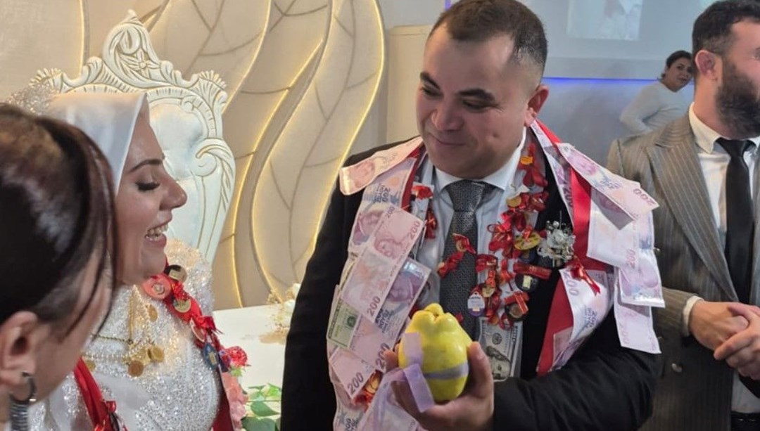 Emre ve Feruze Köse çiftinin düğününde takı merasiminde arkadaşları tarafından damada takı yerine bir tane ayva hediye edildi.