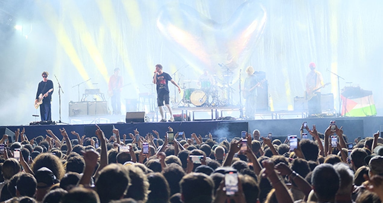 Sahneye Filistin bayrağıyla çıkan gruba, seyirci “Free Palestine” sloganı atarak seslendi.