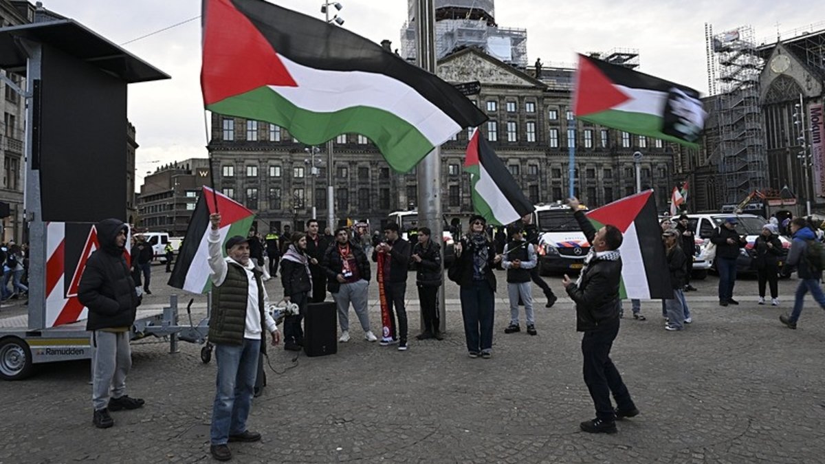 Ajax maçı öncesi Amsterdam’daki Dam Meydanı’nda toplanan Galatasaraylı taraftarlar, Filistin bayrakları salladı.