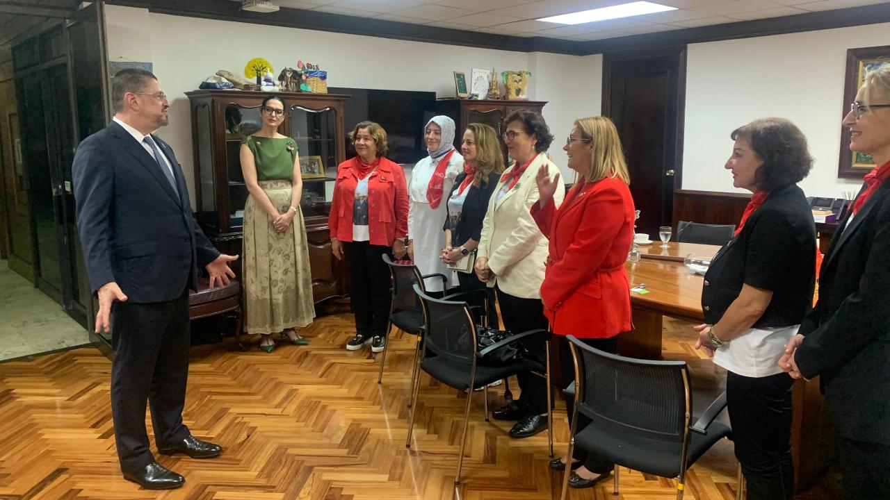 Türkiye’nin Kosta Rika Büyükelçisi Naciye Gökçen Kaya başkanlığındaki Ege İş Kadınları Derneği (EGİKAD) ve TOBB Kadın Girişimciler Kurulu üyeleri, başkent San Hose’deki Cumhurbaşkanlığı Sarayı’nda Kosta Rika lideri Chaves’in eşi Signe Zeikate tarafından kabul edildi.