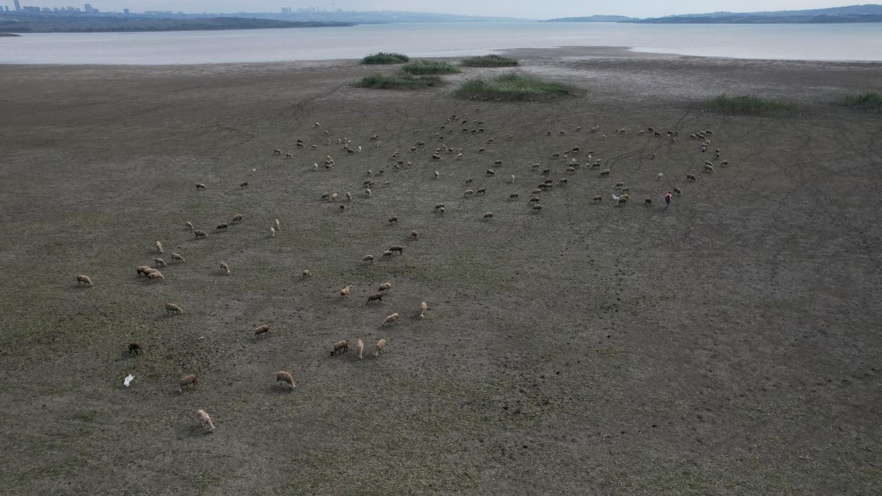 Kuraklık gözler önüne serildi Dron ile havadan yapılan çekimlerde, kuraklık gözler önüne serildi. Kuruyan alanlarda çobanlar tarafından koyunların otlatıldığı görüldü