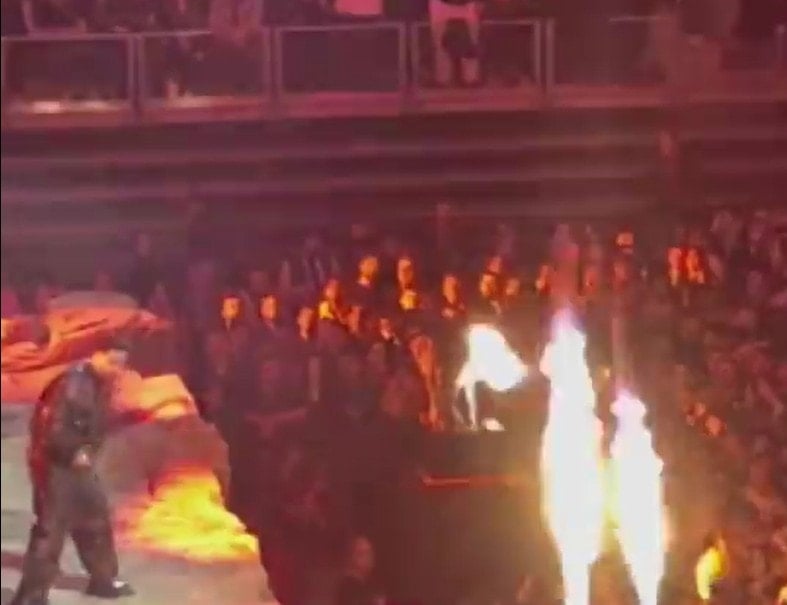 Sosyal medyada paylaşılan bir görüntüde, sahneye atlamaya çalışan bir hayranının güvenlik bariyerlerine takıldığı ve bu sırada kalçasının alevlerden tutuştuğu görüldü.