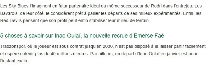 Haberde, Trabzonspor ile 2030’a kadar sözleşmesi bulunan Inao Oulai’nin oyuncuyu kolay bırakmayacağı ifade edildi. Ayrıca bordo-mavililerin, oyuncu için 40 milyon euronun üzerinde bir bonservis beklediği ve ocak ayında bir ayrılığın kesin olarak reddedildiği belirtildi.