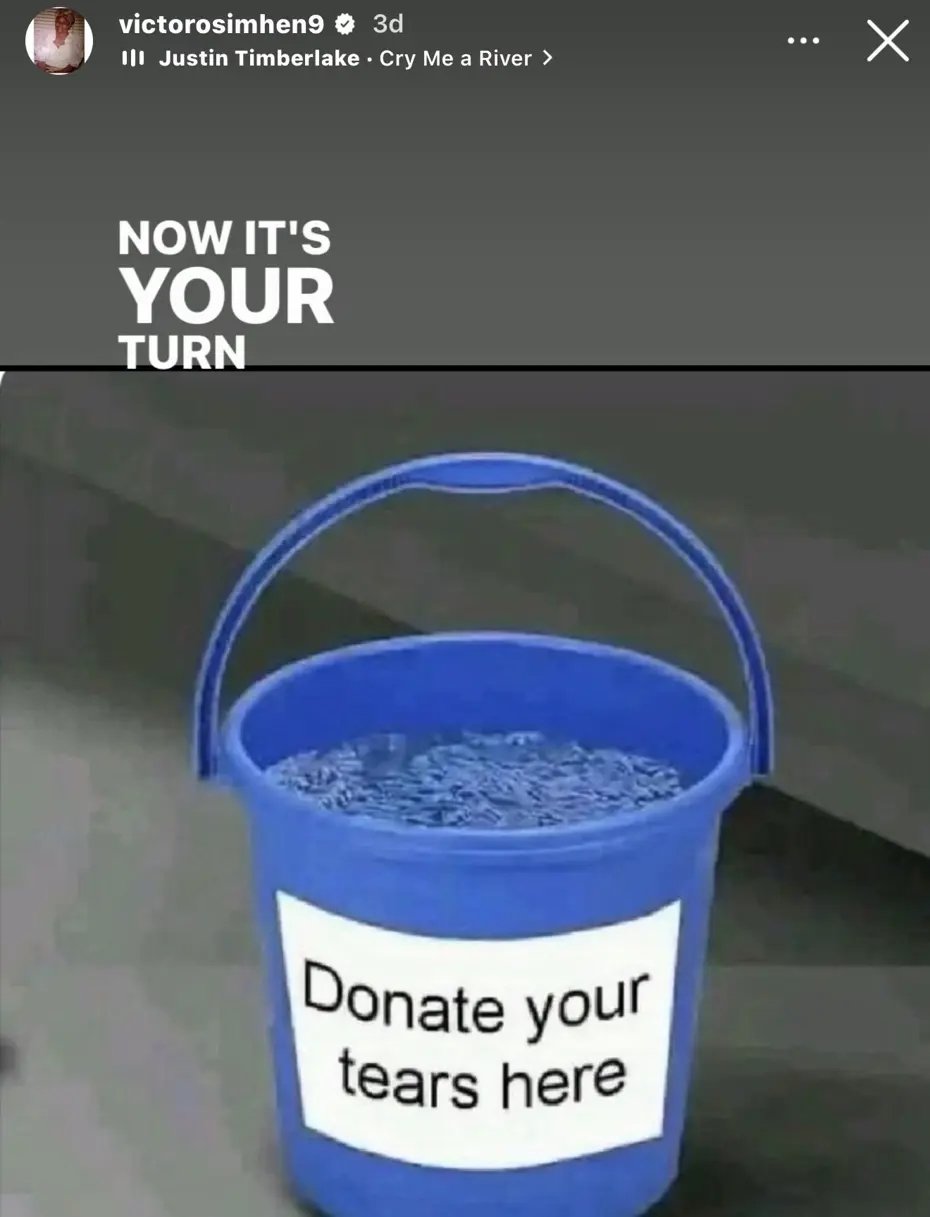 Osimhen, Instagram hesabında su dolu kova üzerine “Gözyaşlarını buraya bağışla” yazılı fotoğraf paylaştı.