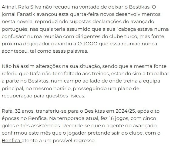 Haberde yer alan bilgilere göre, oyuncuya yakın bir kaynak, Rafa Silva ile Beşiktaş yöneticileri arasında herhangi bir görüşme olmadığını ve basında yer alan açıklamaların oyuncu tarafından yapılmadığını aktardı.