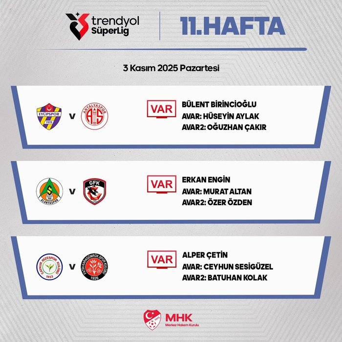 Trendyol Süper Lig’de 11. hafta heyecanı yaşanmaya devam ediyor. Türkiye Futbol Federasyonu, bugün oynanacak 3 maçın VAR hakemlerini duyurdu. İşte ayrıntılar… | Son dakika spor haberleri