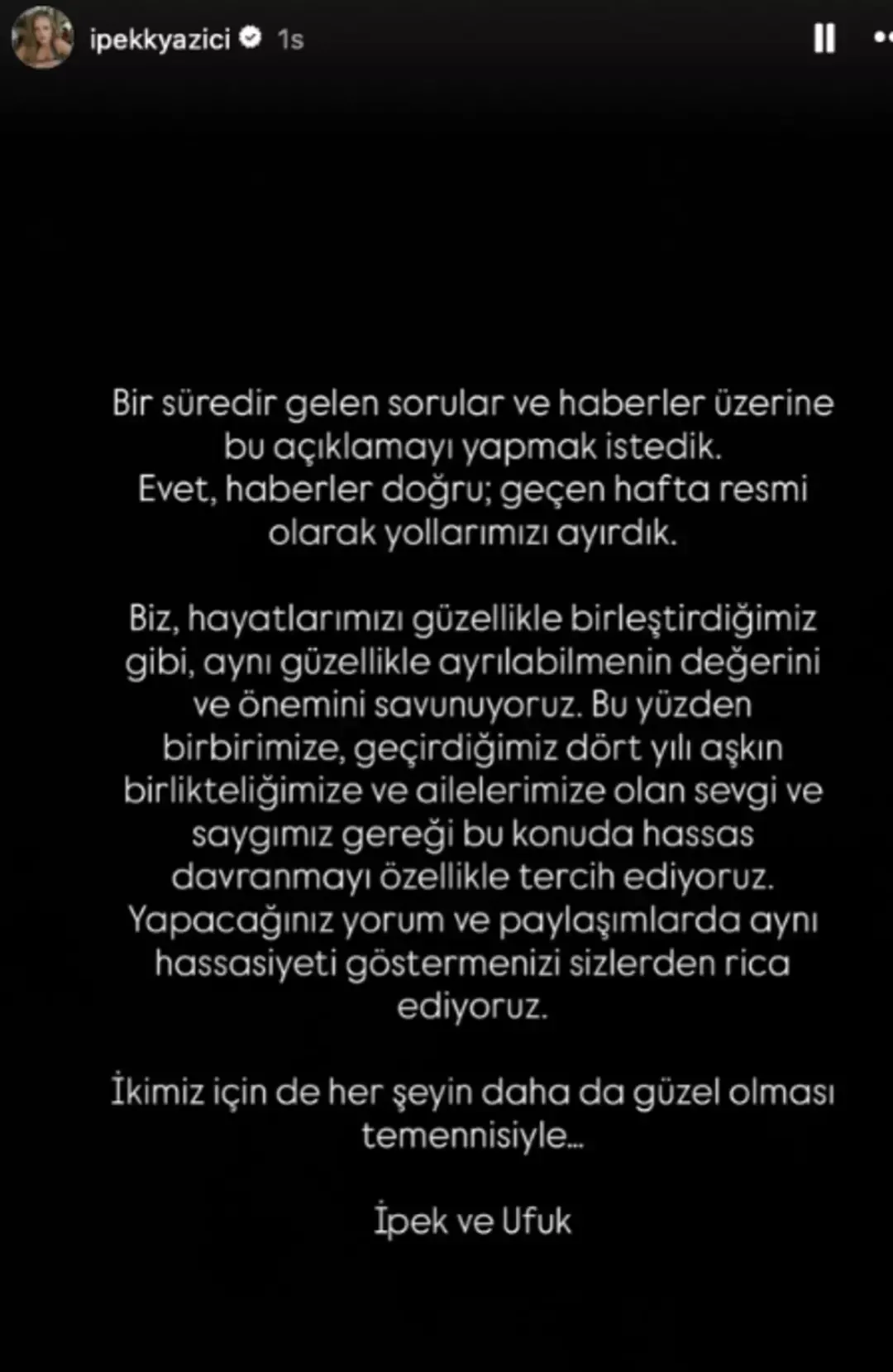 “Bir süredir gelen sorular ve haberler üzerine bu açıklamayı yapmak istedik. Evet haberler doğru; geçen hafta resmi olarak yollarımızı ayırdık. Biz, hayatlarımızı güzellikle birleştirdiğimiz gibi, aynı güzellikle ayrılabilmenin değerini ve önemini savunuyoruz. Bu yüzden birbirimize, geçtiğimiz dört yılı aşkın birlikteliğimize ve ailelerimize olan sevgi ve saygımız gereği bu konuda hassas davranmayı özellikle tercih ediyoruz. Yapacağınız yorum ve paylaşımlarda aynı hassasiyeti göstermenizi sizlerden rica ediyoruz. İkimiz için de her şeyin daha da güzel olması temennisiyle…”