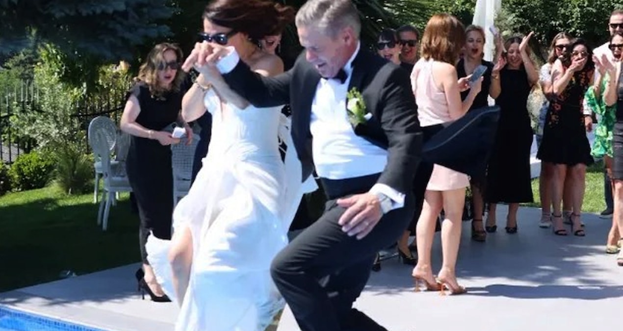 Gamze Saraçoğlu ile eşi Thomas Konietzko hava çok sıcak olunca nikâhın ardından damatlık ve gelinlikleri ile havuza atladı.