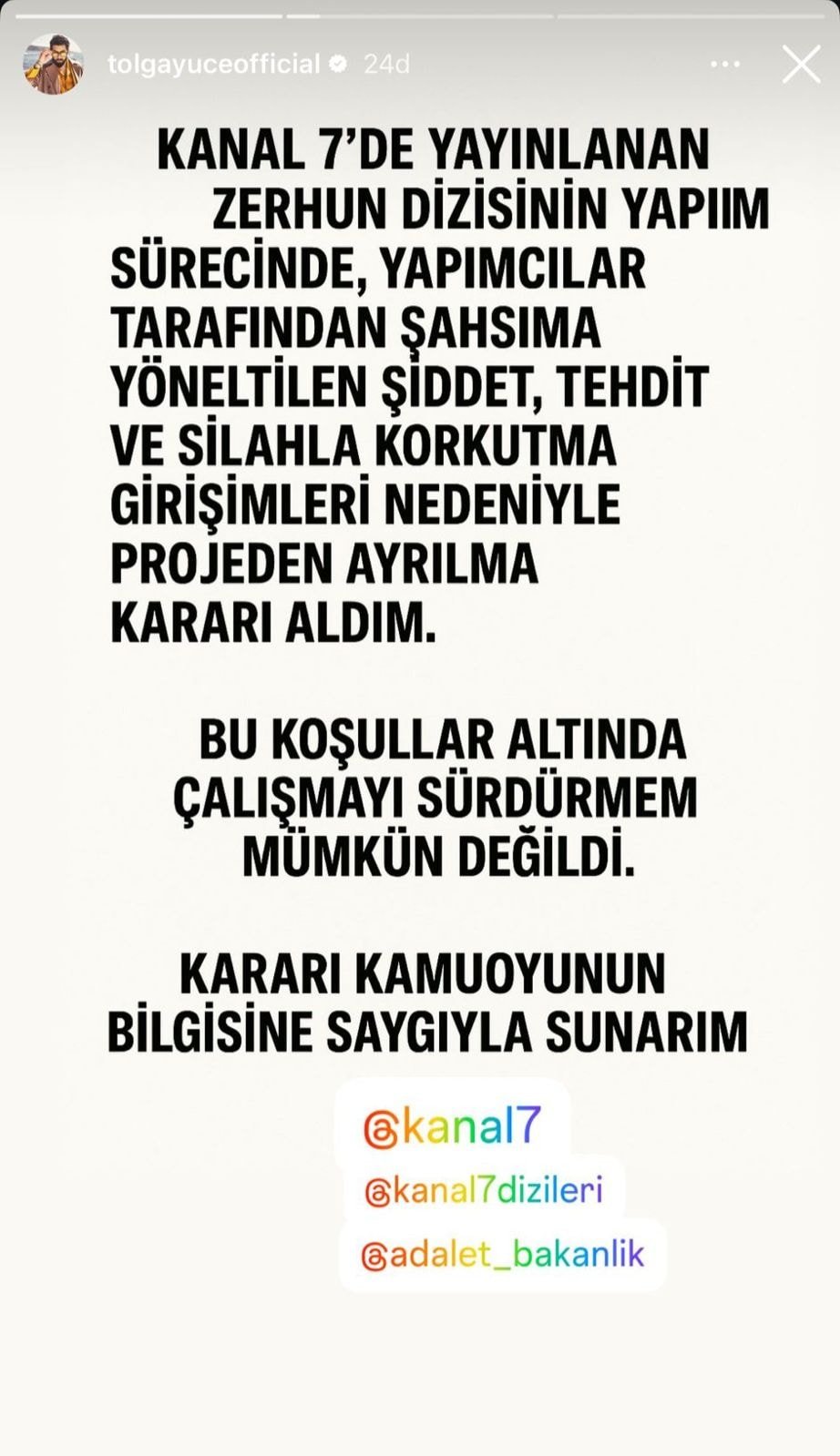Kanal 7’de yayınlanan Zerhun dizisinin yapım sürecinde yapımcılar tarafından şahsıma yöneltilen şiddet, tehdit ve silahla korkutma girişimleri nedeniyle projeden ayrılma kararı aldım.” dedi.