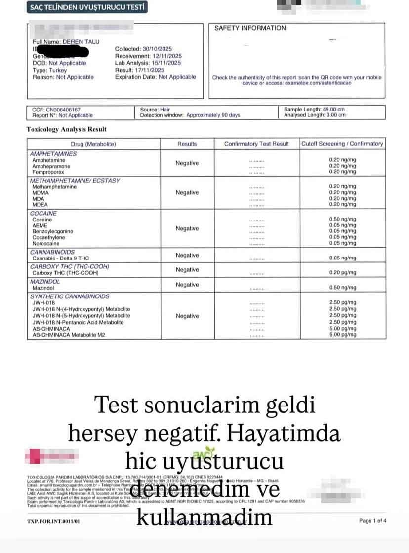 Deren Talu sosyal medyada yaptırdığı uyuşturucu testinin sonucunu duyurdu.