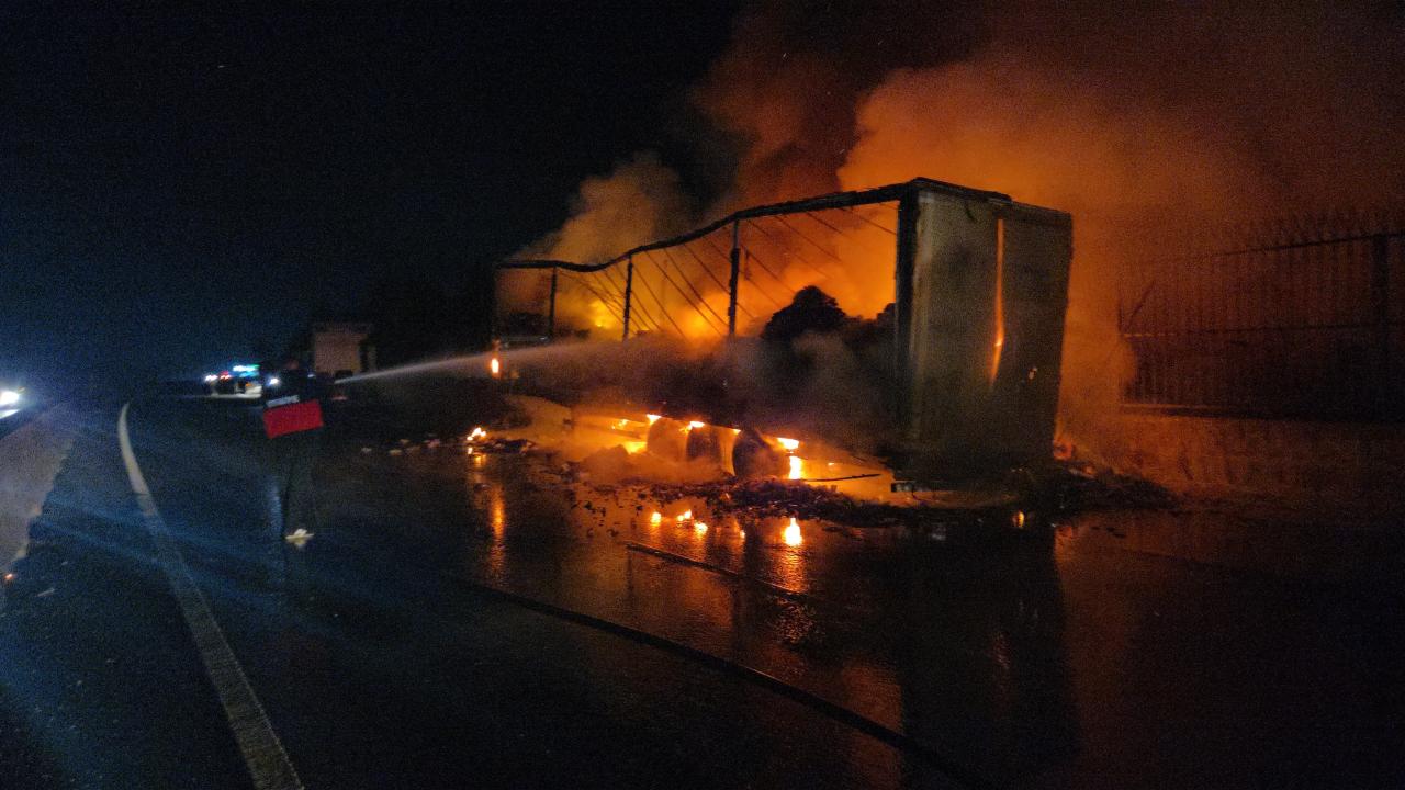 Yalova-Kocaeli kara yolunun Çiftlikköy ilçesi yakınlarında, seyir halindeki konserve yüklü tırın dorsesinde henüz belirlenemeyen nedenle yangın çıktı.