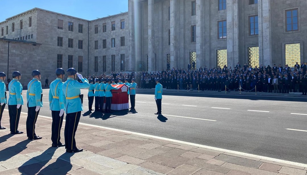 Şendiller’in Türk bayrağına sarılı tabutu, görevlilerin omuzlarında TBMM şeref kapısı merdivenleri önüne getirildi.